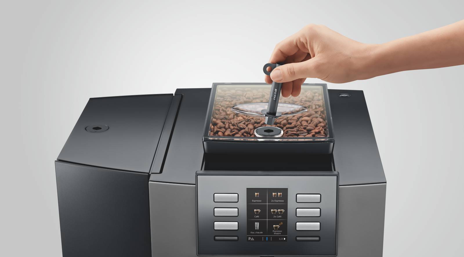 Toutes les commandes de la machine à café JURA X6 sont placées à l'avant de la machine, clairement identifiable et facilement accessible. Même le remplissage du réservoir d'eau et du récipient à grains peut se faire par l'avant.